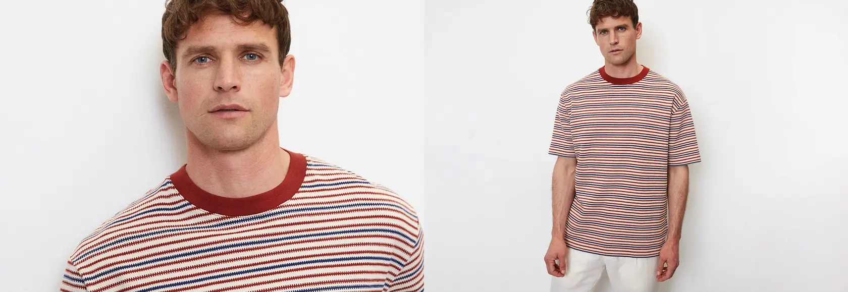 Stripes emphasise any look. Whether thin, striking or multi-coloured. Check out our new arrivals with stripes. Lightweight shirts and casual T-shirts made of certified organic cotton or pure linen. Combined with chinos and shorts in white, black & navy.