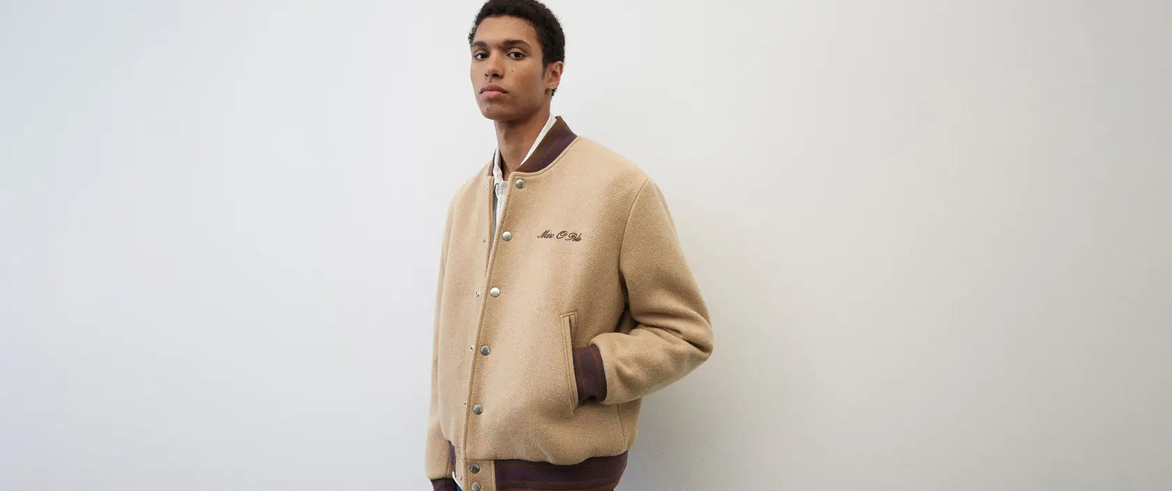 The college-inspired bomber jacket in beige. Combined with a white pinstripe shirt and dark blue denim.