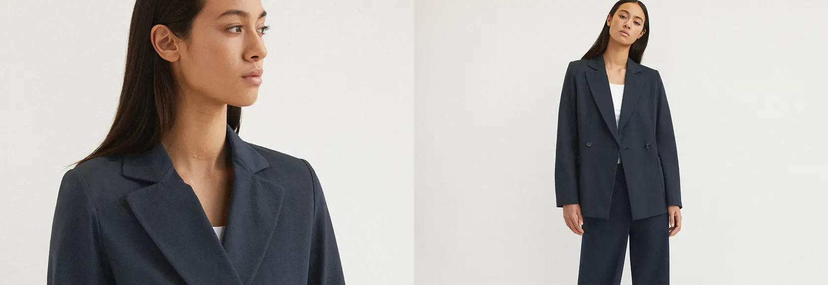 Pour plus d'empowerment : des looks de costume dans des couleurs fortes comme le berry lilac, le vert gazon ou le bleu marine. Des blazers sportifs en jersey avec une touche d'élégance et des pantalons au style chino épuré confèrent ainsi au look de costume une touche printanière et beaucoup de puissance pour la nouvelle saison.